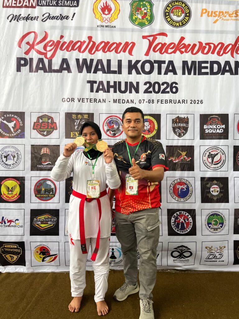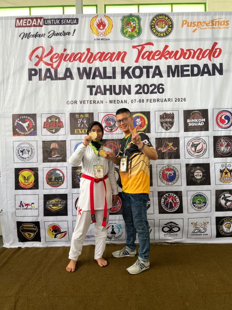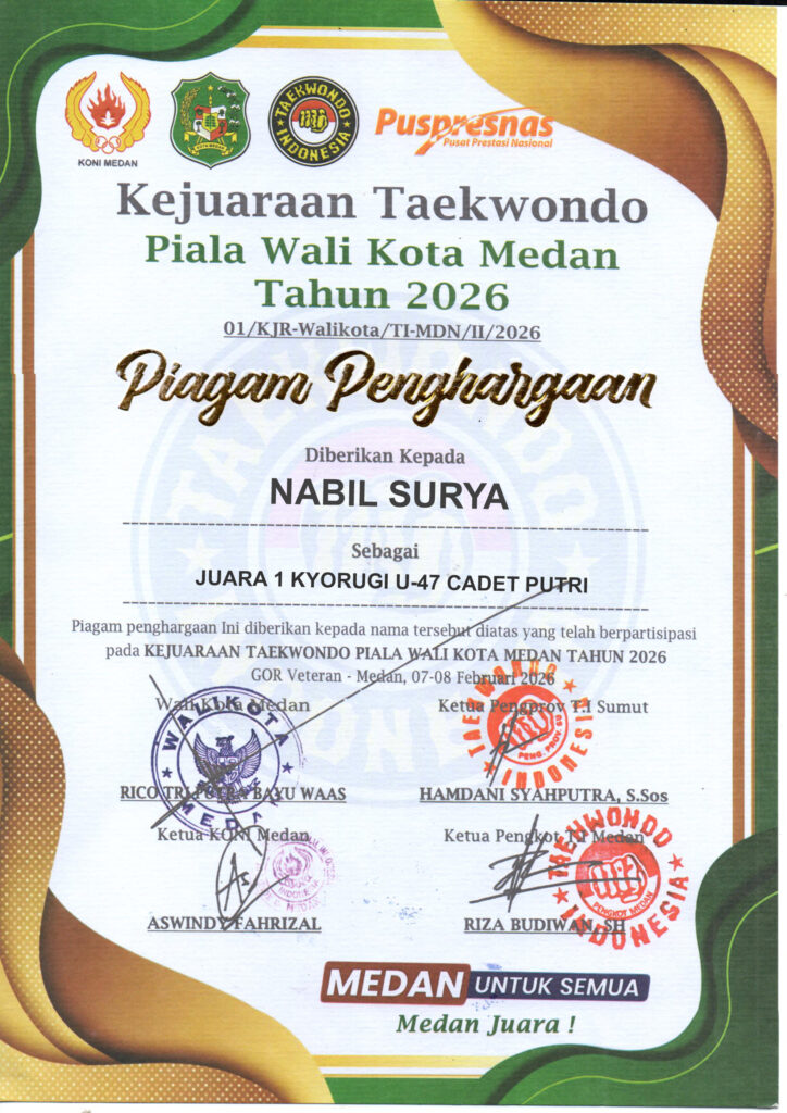 Atas prestasinya meraih Medali Emas, JUARA 1 KYORUGI U-47 CADET PUTRI pada Kejuaraan Taekwondo Piala Wali Kota Medan Tahun 2026 yang diselenggarakan di Gor Veteran pada tanggal 7-8 Februari 2026.